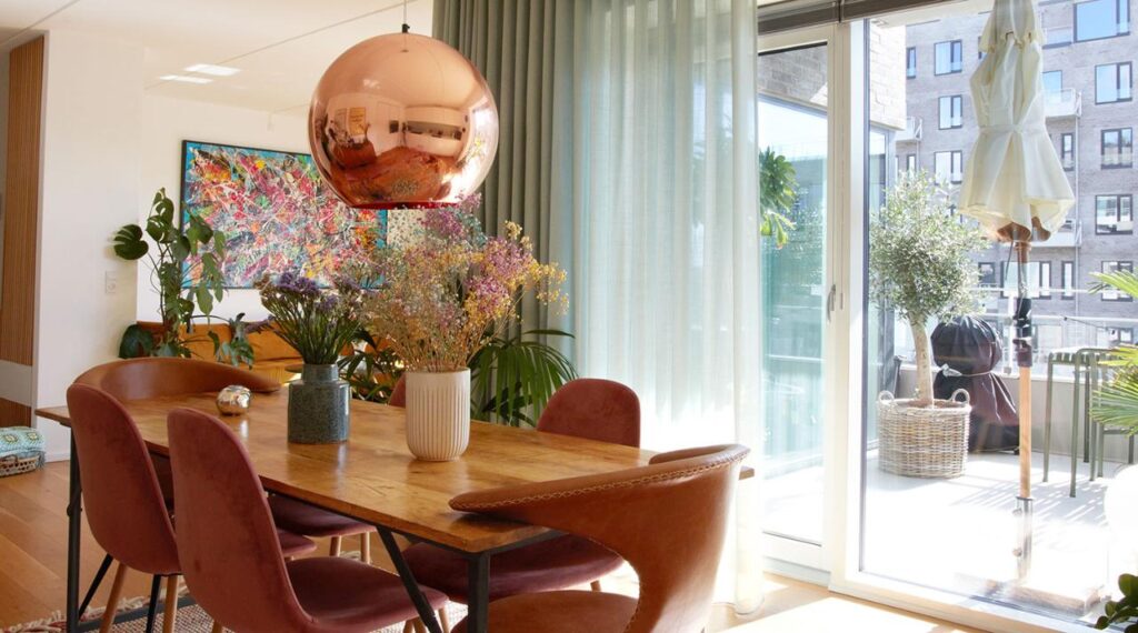 “Når man bor i et nybyggeri, som jeg gør, så må der gerne ske lidt. Det er meget glas og beton, så der skal ske noget, for at der kommer personlighed ind i lejligheden. Derfor valgte jeg blandt andet denne farve i stuen, som også matcher klinkerne i køkkenet. Og så er det jo fedt, at man kan matche sine gardiner ud fra de farver, man i forvejen har i sit hjem. Så kan man spice en forholdsvis intetsigende lejlighed op og sætte sit personlige præg.“, fortæller Hemmingsen.