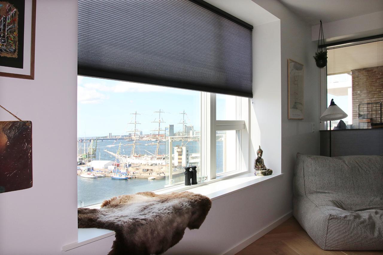 Løsningen i stuen med DUO PLISSÉGARDINER, og så nogle gange kaldt for Duette®, fra BOTEX HIGHLINE® har givet parret lige præcis de tre ting, som var allervigtigst. Nemlig at de ikke tager for meget af den gode udsigt, at de kan SKÆRME FOR EN BLÆNDENDE SOL, og at de er isolerende, så varmen bliver ude om sommeren – og inde om vinteren, når blæsten står på.