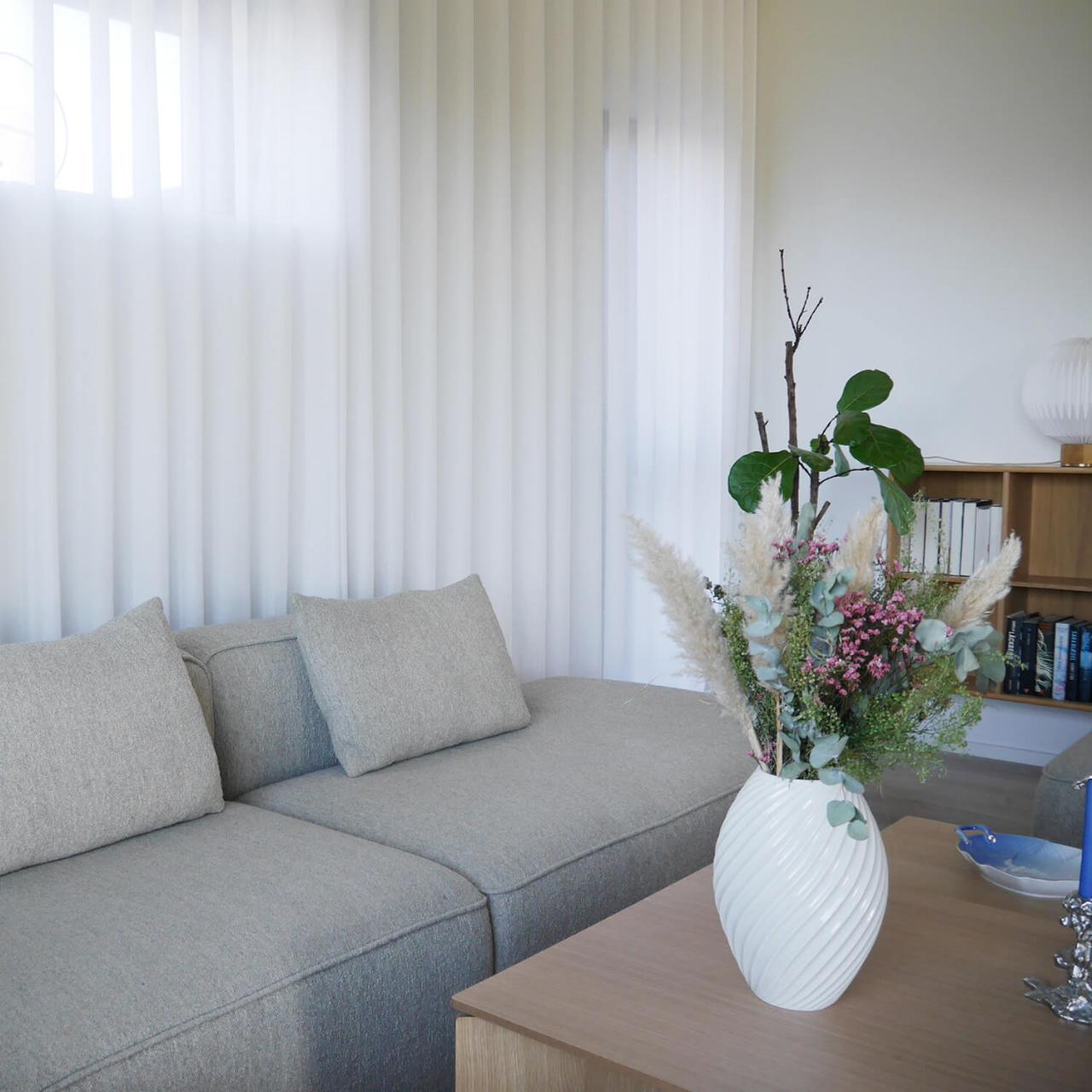 Katrines nye semi-transparente stofgardiner har nu en anden funktion sammenlignet med de tykke velourgardiner, hun tidligere har haft. HVIDE STOFGARDINER med semi-transparente egenskaber giver et andet lysspil i boligen og tillader mere lys. Lyse stofgardiner får i sig selv rum til synes større og mere rummelige.