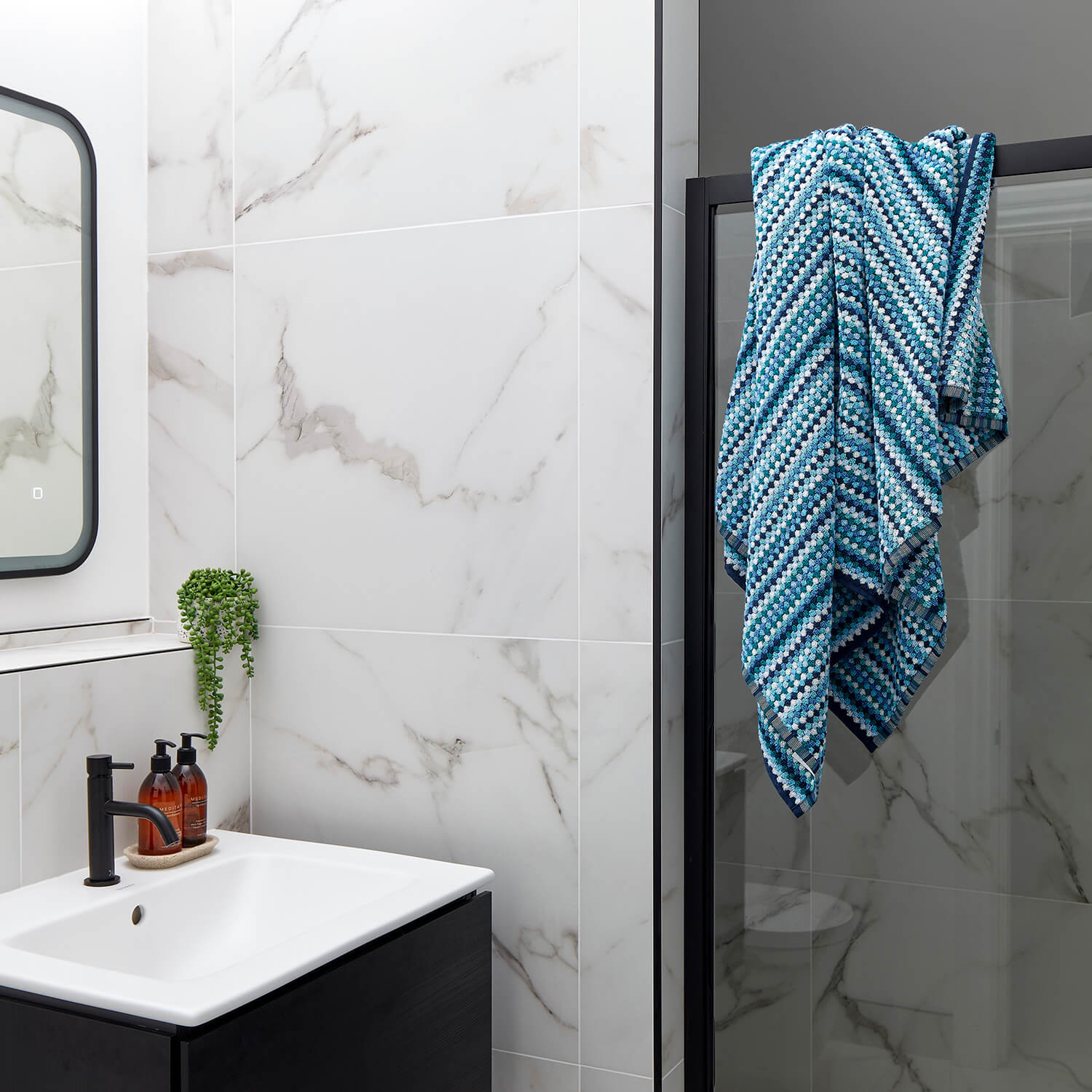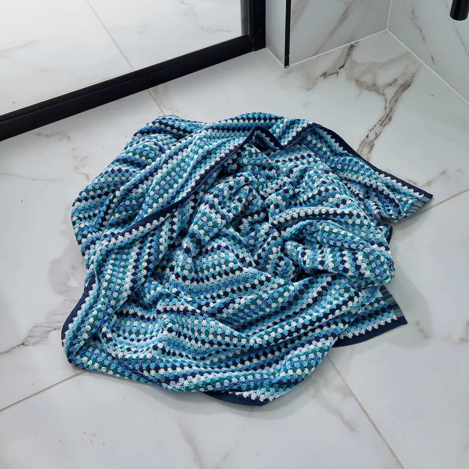 Dette håndklæde har vævet hvide, blå og turkise striber i mønsteret, hvilket giver et ekstra pift til dit badeværelse. Det passer til både det moderne badeværelse, men også til badeværelset med en mere klassisk stil. Håndklædet fra Christy er en del af Carnaby Stripe-serien og er produceret i 100% bomuld.