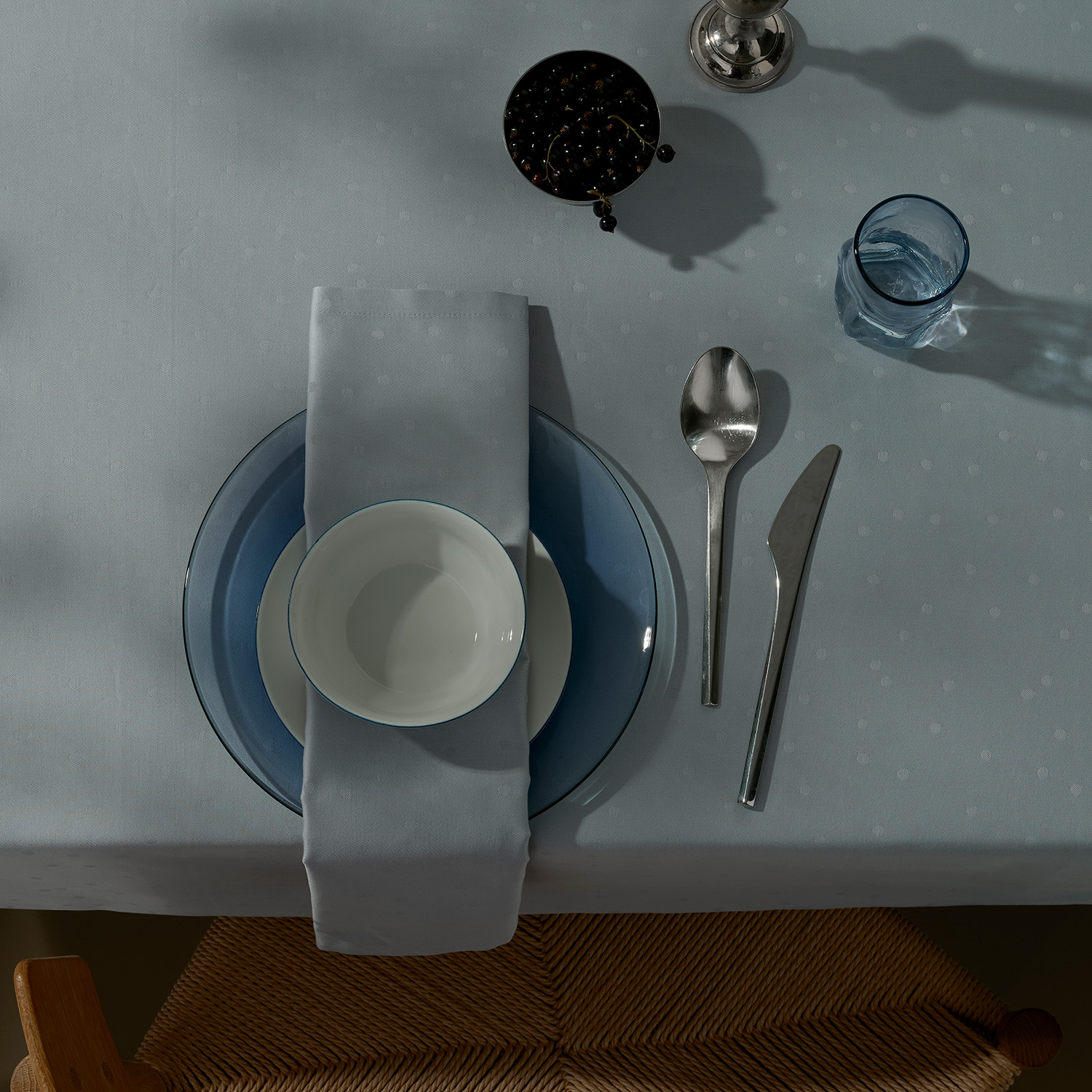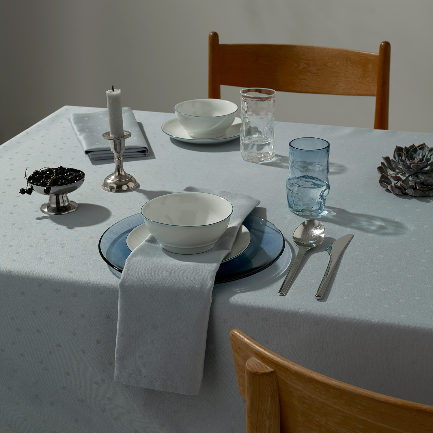 Skab en let og indbydende stemning omkring bordet med Confetti-dugen fra Compliments i farven Mineral Blue. De små prikker i det enkle mønster giver et charmerende og festligt udtryk, mens den damaskvævede bomuld tilfører et elegant og eksklusivt touch.