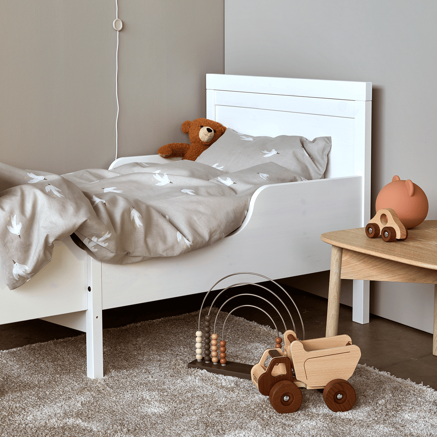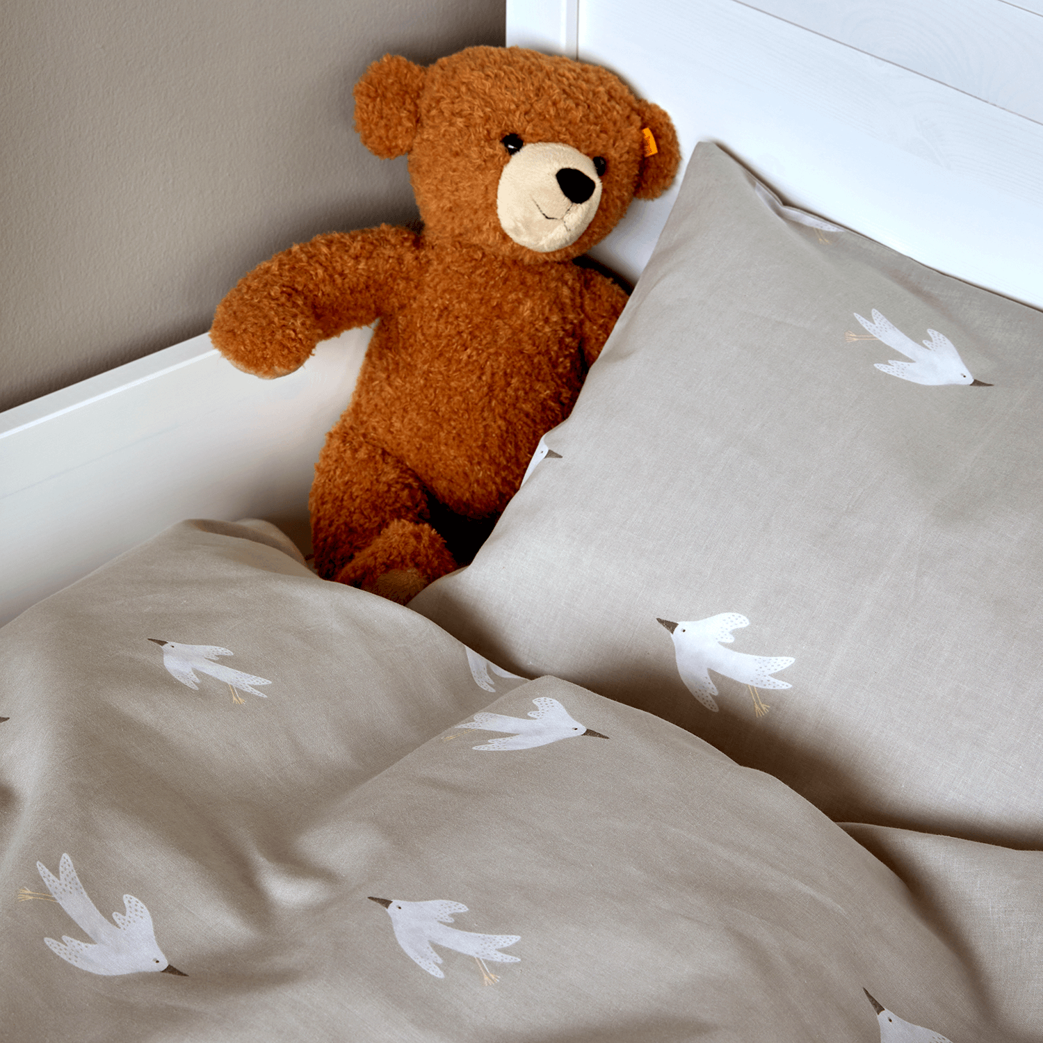 Skab en tryg og rolig atmosfære for den lille med Høie Fina babysengesæt i bløde, naturlige beige toner. Det fine motiv med små fugle skaber en hyggelig stemning på børneværelset.