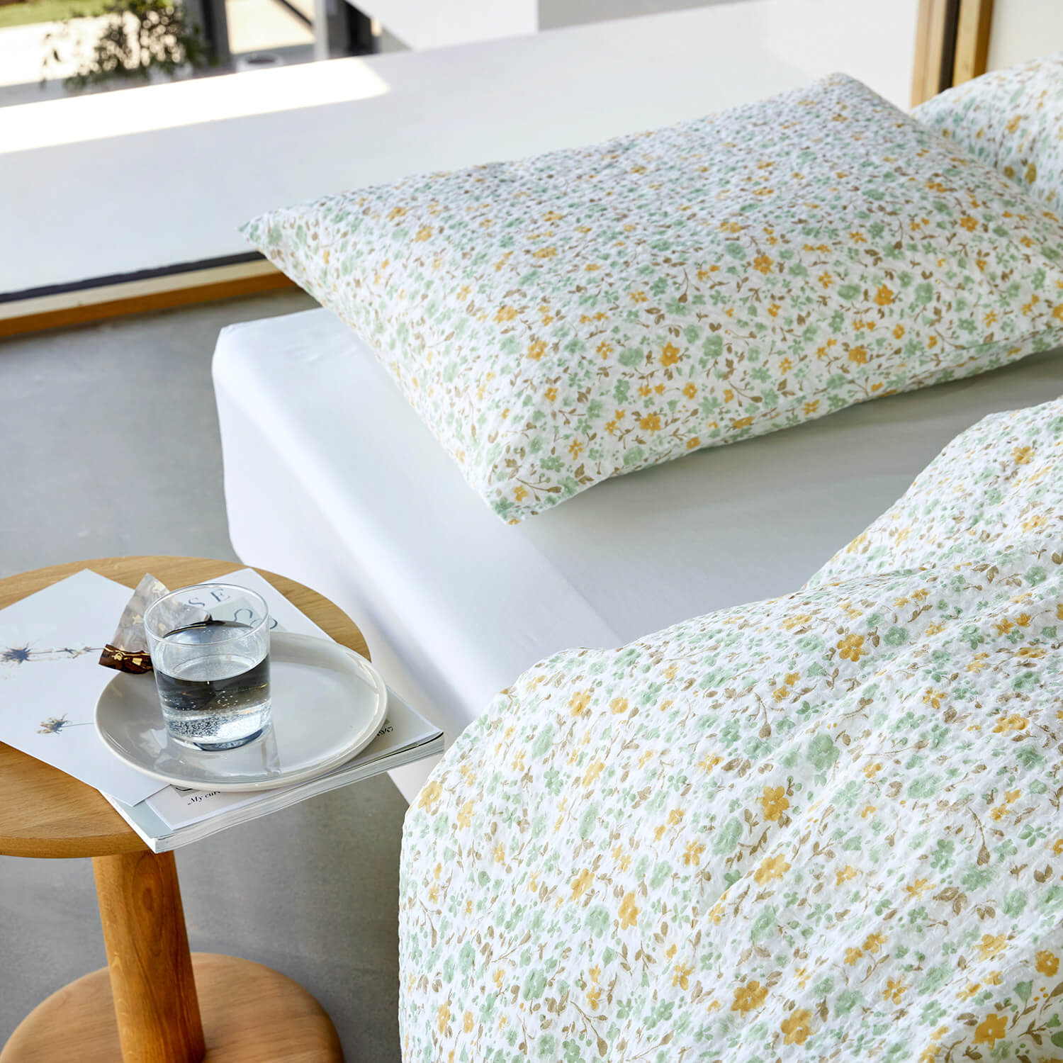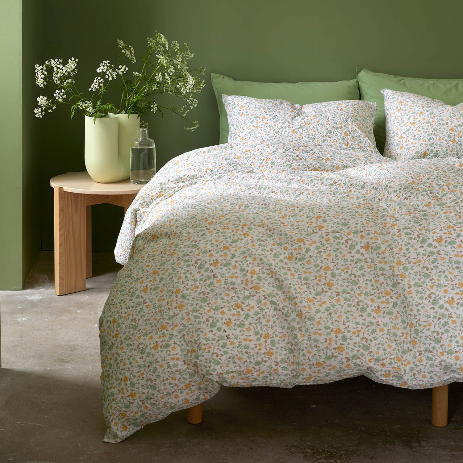 Clara-sengesættet fra Høie i forårsgrøn bringer et let og naturligt udtryk ind i soveværelset med sit fine blomstermønster i bløde, afdæmpede nuancer. Sengesættet er i bæk og bølge-kvalitet, hvilket har en karakteristisk struktur, der skaber små luftlommer i stoffet, hvilket giver god ventilation og en behagelig, kølig følelse mod huden – særligt ideelt til varme nætter.