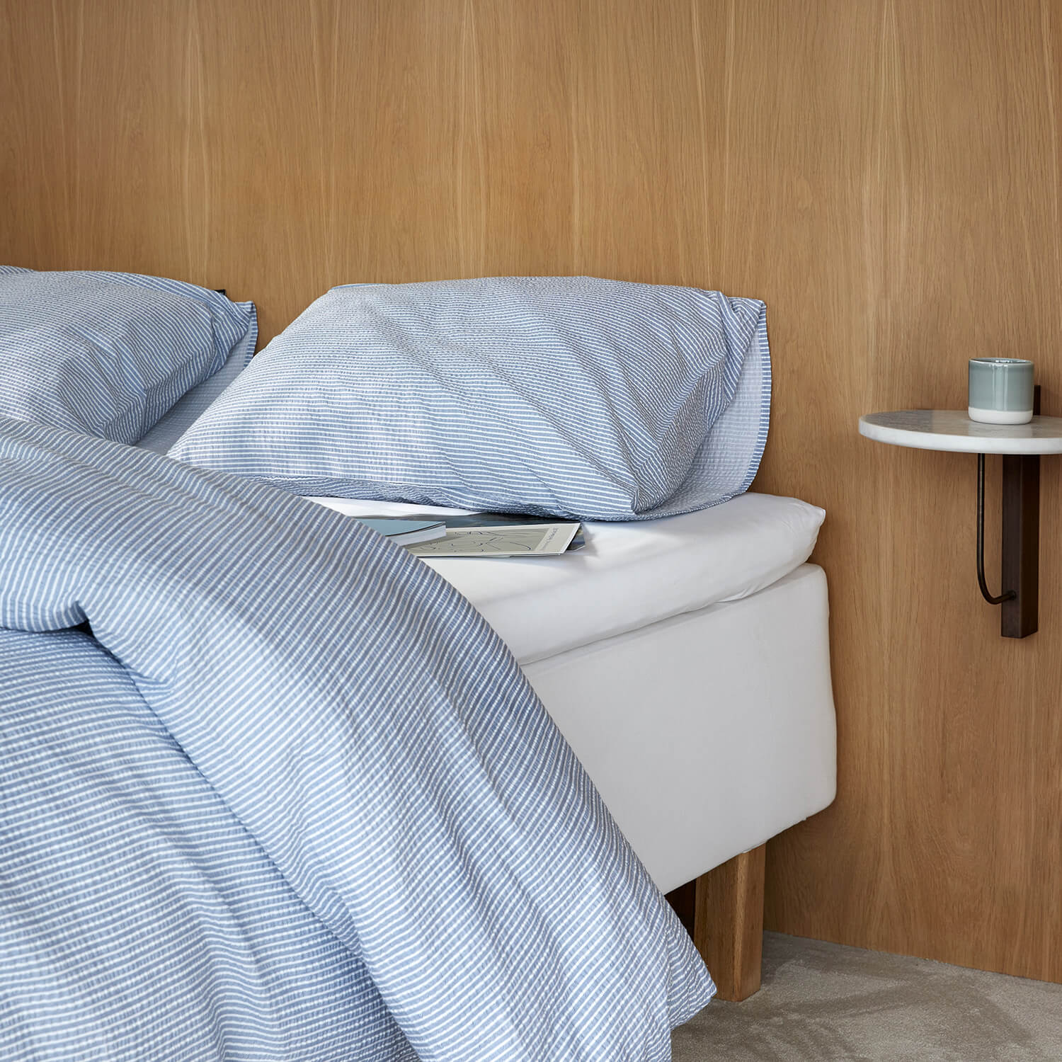 Lykke-sengesættet i 100% bomuld er fremstillet i klassisk bæk og bølge-struktur, som giver en let og luftig kvalitet med et diskret stribet udtryk. Den særlige struktur skaber små luftlommer i stoffet, der sikrer god åndbarhed og en behagelig, kølig følelse natten igennem. Materialet er blødt, smidigt og kræver ingen strygning, hvilket gør det nemt at holde pænt. De fine striber i dæmpede brune toner giver et tidløst, nordisk look, som er let at kombinere med andre tekstiler. Dynebetrækket lukkes med lynlås i bunden for nem og hurtig håndtering.