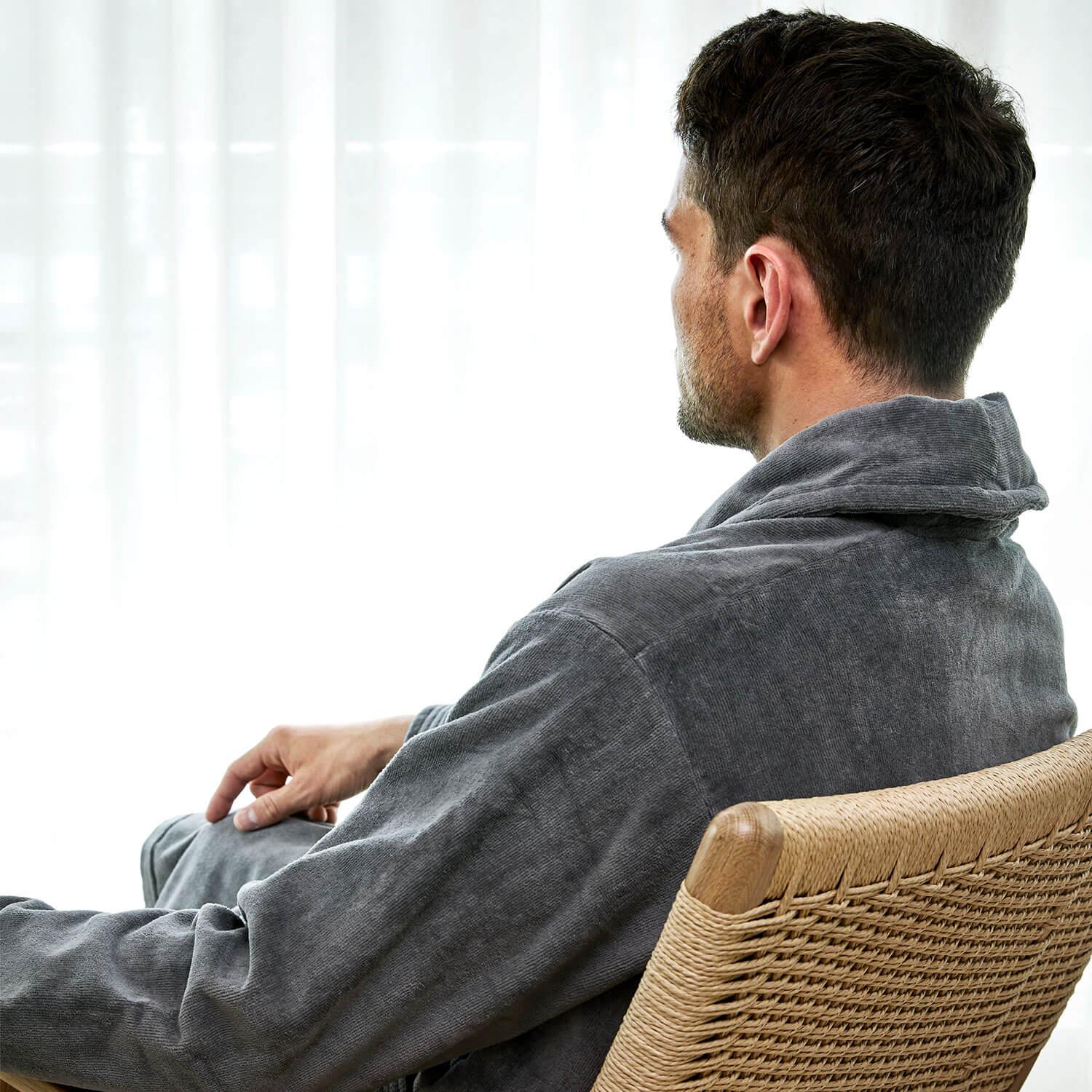 Høies kollektion af morgenkåber til herrer i serien ”Herkules” findes i 3 flotte farver – blandt andet denne fine grå. Morgenkåben er produceret i 100% bomuld og med bomuldsfrotté på indersiden og bomuldsvelour på ydersiden. Det gør den ekstra blød og lækker. Disse morgenkåber kan også bruges som badekåber.