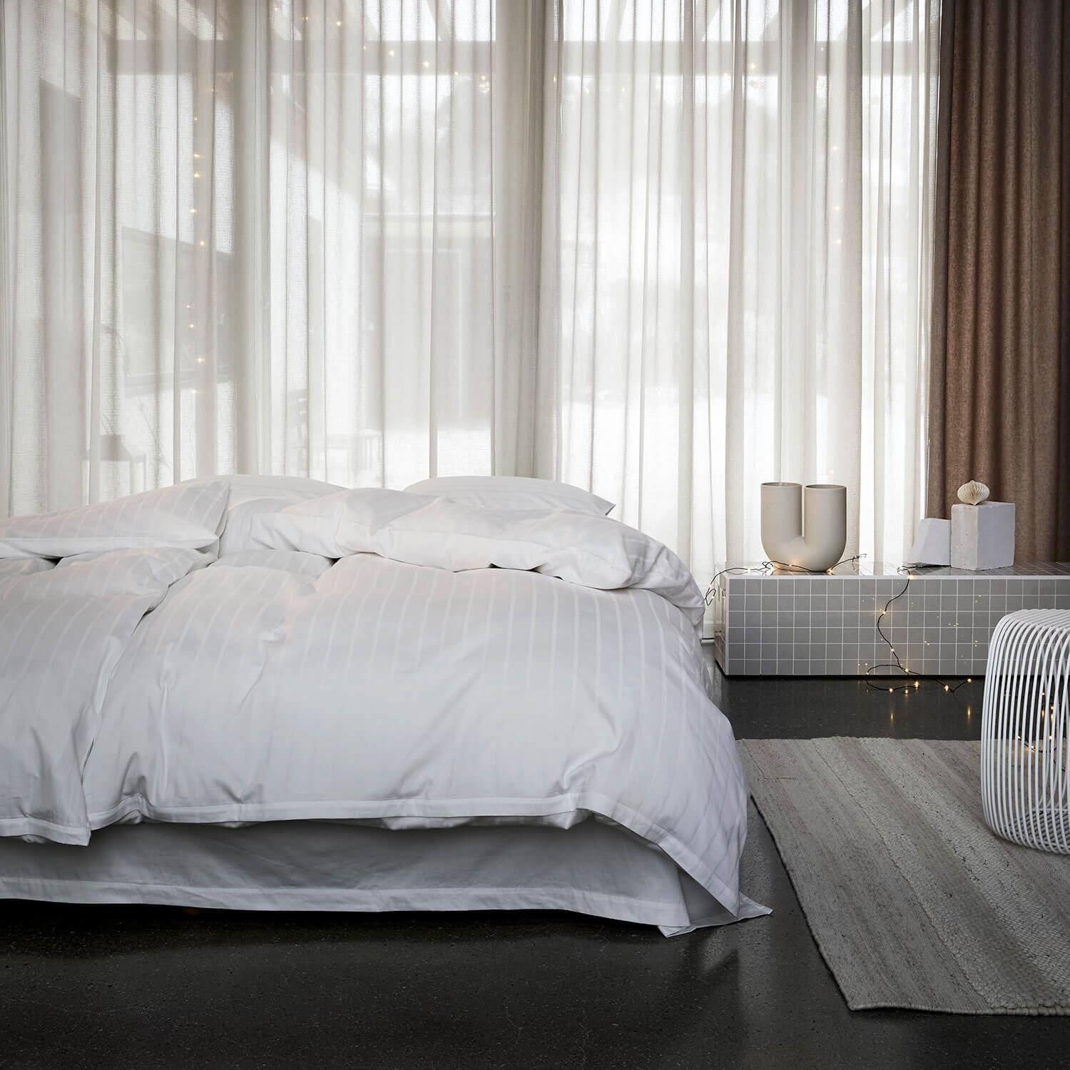 Dette hvide Høie-sengesæt fra serien “Milano” er lavet af 100% bomuldssatin, som giver en blød og behagelig fornemmelse. Sengetøjet har diskrete striber også i hvid, som giver en fint og elegant spil i designet. Sengesættet er desuden også dobbeltvævet, som giver effekt mellem de glatte og matte overflader. Milano-sengesættet er Oeko-Tex-certificeret og er behandlet med ”Easy Care”, hvilket gør, at sættet krøller mindre.