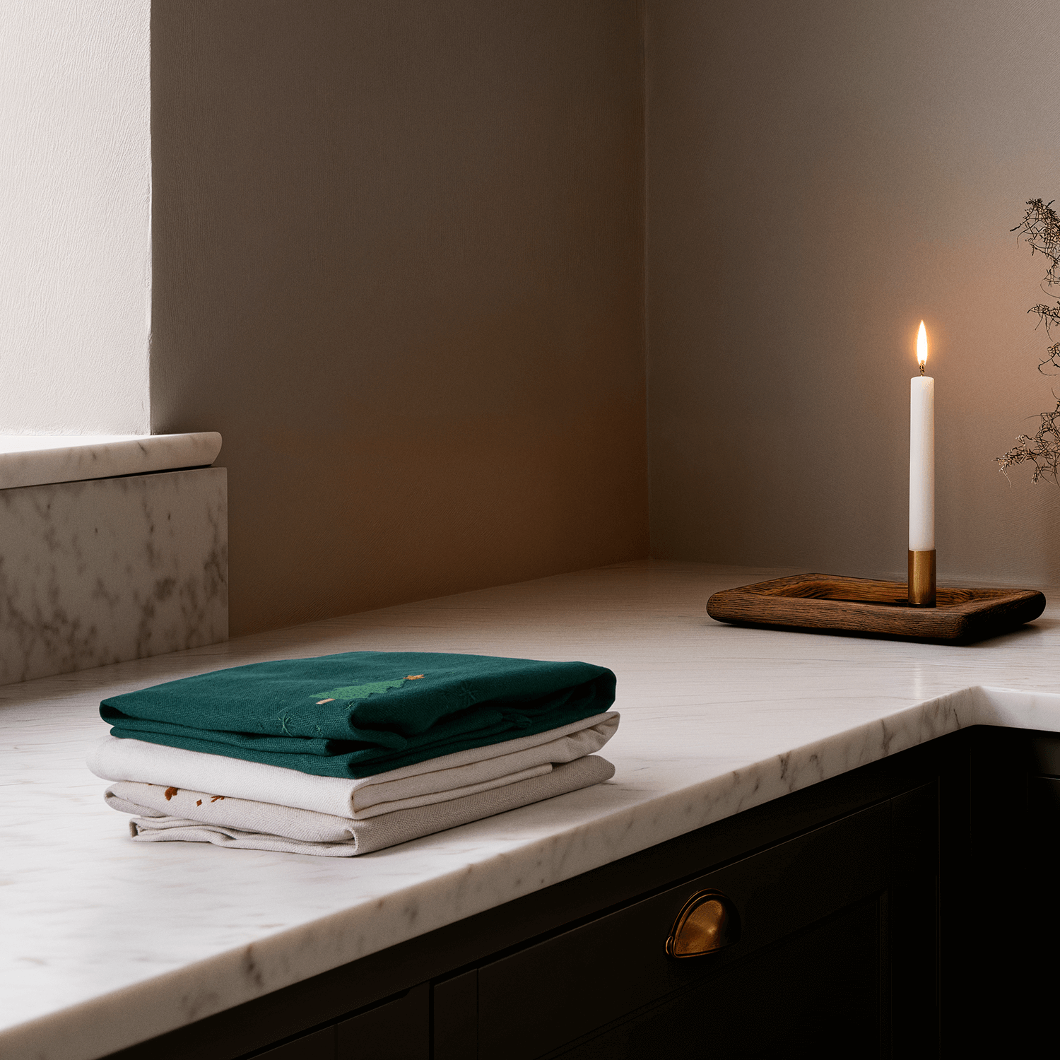Viskestykkerne har et diskret julemønster broderet i form af snefnug og juletræer.