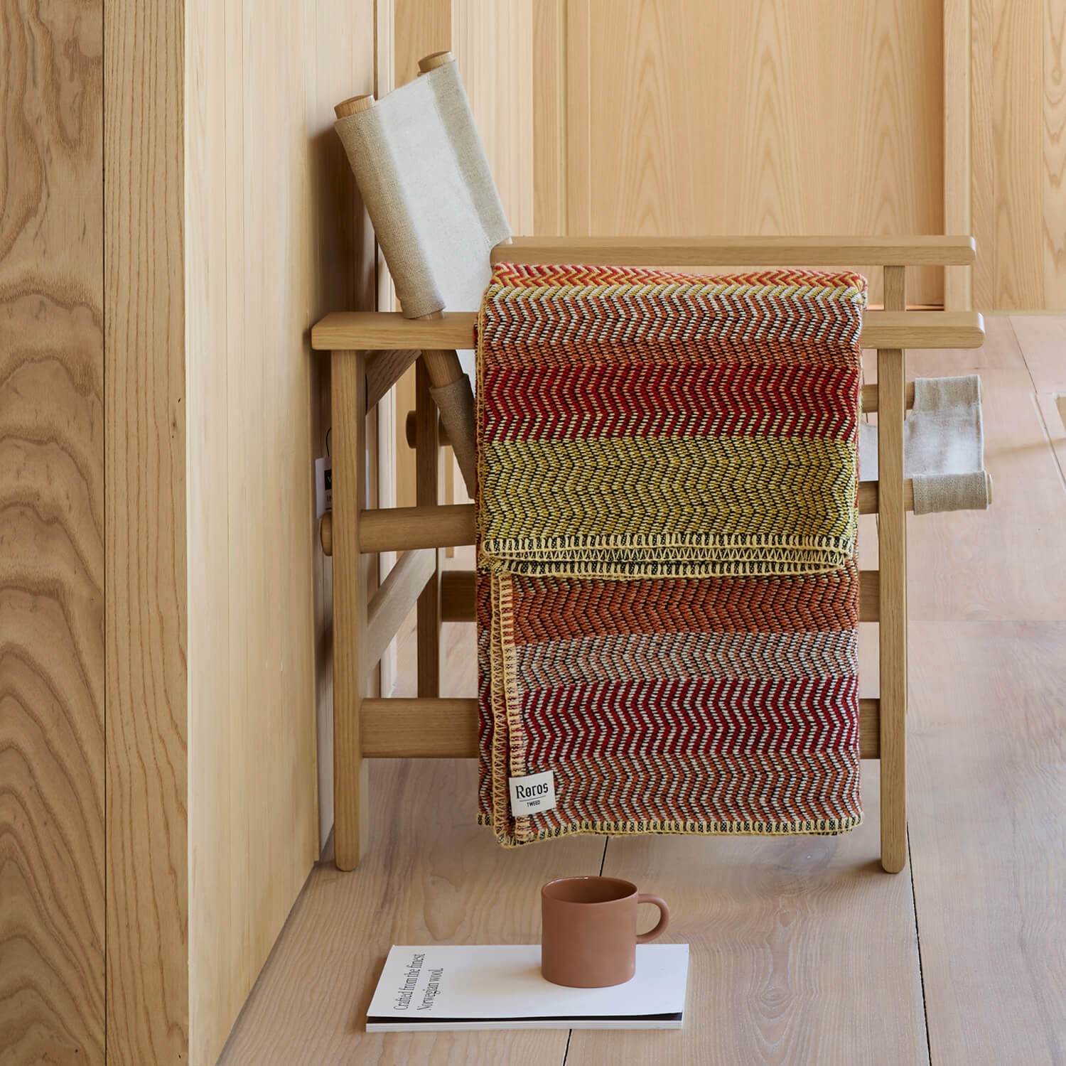 Lækker kvalitetsplaid i 100% norsk uld. Plaiden har et unikt siksak-mønster, inspireret af de norske fjeldhytter, hvilket giver det et hyggeligt og indbydende udtryk. Fås i 6 fine farvekombinationer, her i skønne gule og røde nuancer.
