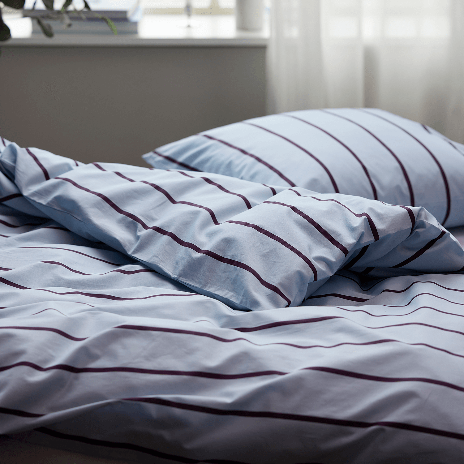 Södahls Echo-sengesæt giver soveværelset et enkelt og moderne udtryk. Det er fremstillet i 100% økologisk bomuld og er Svanemærket, hvilket sikrer en ansvarlig kvalitet. Her ses farven Sky Blue, som udover den lyseblå nuance også er designet med smalle, lodrette striber, der tilfører et tidløst præg med en fin balance mellem klassisk og nutidigt.