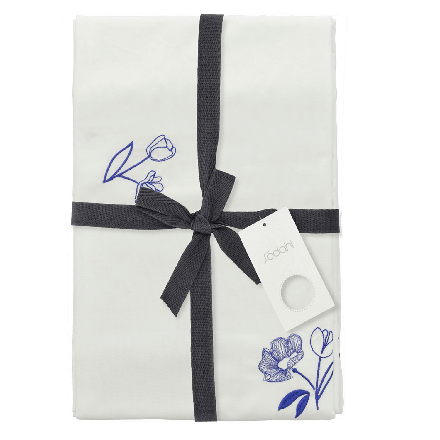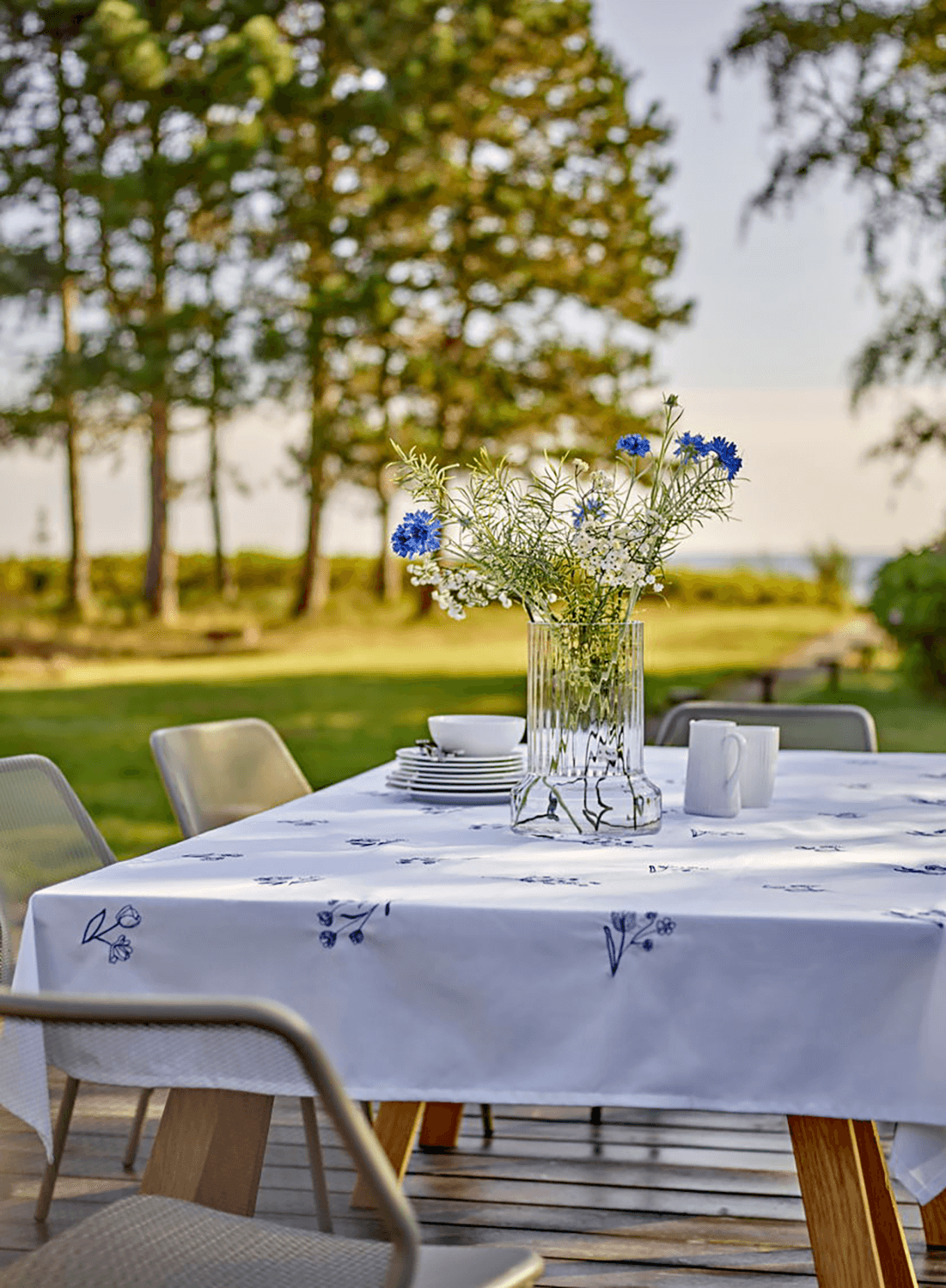 Skab en indbydende stemning omkring bordet med denne elegante, broderede dug i blød hvid nuance. De fine, blå blomsterbuketter tilfører et let og dekorativt udtryk, der bringer fornemmelsen af forår og friskhed ind i hjemmet – uanset årstid.